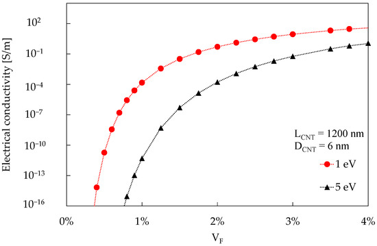 With the proposed procedure, it is then possible to estimate the electrical conductivity for a CNT-reinforced polymer as a function of VF by just providing a value for AR, DCNT, and Simmons’ equation energy barrier. An example is reported in Figure 7, where the electrical conductivity of a polymer containing CNTs of length 1200 nm and diameter 6 nm is simulated for two values of energy barrier, namely 1 eV and 5 eV, as a function of the CNT volume fraction.