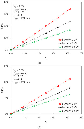 The proposed methodology is useful for estimating the effectiveness of a composite blend in detecting the strain applied to the material. Following the approach proposed in Section 3.5, the strain-sensing effect based on the specimen’s electrical conductivity can be studied very straightforwardly. An example is reported in Figure 8a,b, in the case of an RVE subjected to tension in the y direction, with the x and z directions free to deform according to Poisson law. εy represents the strain applied to the RVE. Elastic properties are representative of an average epoxy resin, with the Young modulus E = 3 GPa, and Poisson coefficient ν = 0.33, whereas the reinforcements are CNTs of length 1200 nm and diameter 6 nm at two different volume fractions (1% in Figure 8a and 3% in Figure 8b). Three different values for the energy barriers are reported: 0.5 eV, 1 eV, and 2 eV. The model predicts that a higher energy barrier, at volume fractions above percolation, results in a higher strain-sensing sensitivity, defined as the ratio between the RVE electrical resistance variation, ΔR, and the RVE initial electrical resistance, R0. At the same time, a higher VF negatively affects the sensitivity to strain. These results are congruent with the trends exhibited in Figure 7, where a higher slope of the curves corresponds to a higher sensitivity to strain. These results are coherent with those reported in [48], where the authors presented analytical and experimental evidence of the described trends, and the results reported in [39], where the increase in the height of barrier potential led to a more sensitive piezoresistivity. Considering reference [33], where a computational investigation on strain sensitivity in CNT-modified polymers is compared with experimental data, the increase in CNT VF again resulted in a decrease in strain sensitivity, and the overall magnitude of strain sensitivity agrees with that predicted by the proposed methodology.