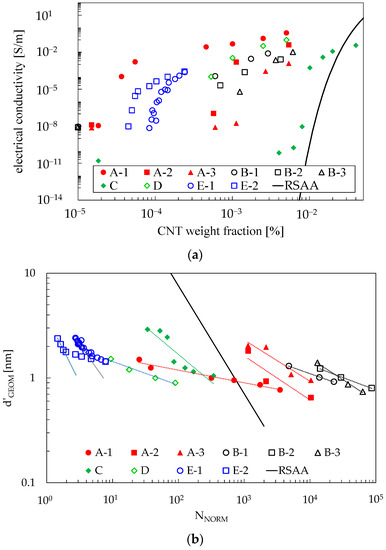 Figure 9a provides an overview of the composites’ conductivity considering CNT weight fractions, but such a representation is not able to take into account the different lengths and aspect ratios of CNTs. Figure 9b elaborates on the data of Figure 9a, inferring d’GEOM as a function of NNORM to filter out the effects of different CNT lengths and aspect ratios, following the considerations of Section 4.1. Considering that the interparticle distance at which electrical percolation is reached in this class of materials (i.e., dMAT) is between 1 and 2 nm (as reported in [39]), it can be seen that such a condition is reached regardless of the actual NNORM. This outcome is supported by the experimental results and conclusions reported in [28], where the authors observed that CNTs spontaneously form aggregates that subsequently agglomerate, resulting in a macroscopic network covering large volume fractions of the epoxy. Moreover, the authors remarked that long CNTs and short CNTs follow different mechanisms. It means that the real behavior of these materials cannot be properly represented by an RVE generated with random distributions of reinforcements.