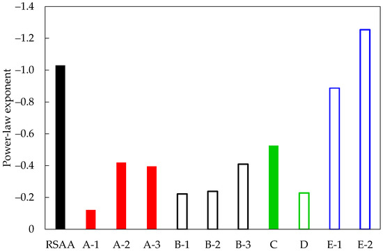 To bring further evidence to the limitations of the RSA algorithm in modeling CNT-modified polymers, in Figure 10, a comparison regarding the slope of the best-fit curves plotted in Figure 9b is presented. Two facts are clear: