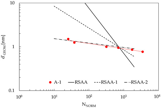 Values for d’GEOM obtained from different power laws, together with the trend of A-1 already reported in Figure 9b.