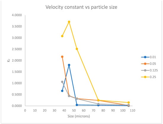 The values obtained from the velocity constant K2 were taken and plotted against the particle size in the AC dosages (0.01, 0.05, 0.125, and 0.25 g), as shown in Figure 3.