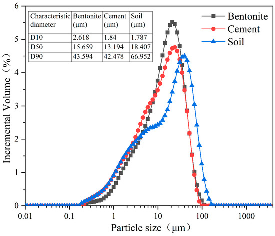 Particle size distributions of the soil, cement, and bentonite.