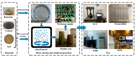 Therefore, in this study, an SCB backfill with the same slump was prepared. The effects of different slurry ratios on the initial moisture content of the material were analyzed at the same slurry slumping. We studied how different cement and bentonite contents and curing time affected the engineering characteristics (UCS and permeability) of SCB backfill. In addition, a combination of nuclear magnetic resonance (NMR) tests and scanning electron microscopy (SEM) revealed the effects of the curing age and each major component on the micromorphology and pore structure of the SCB backfill. Finally, the relationship between the pore structure and engineering properties of the SCB backfill was analyzed and discussed, and the relationship between the pore structure and engineering properties was quantitively studied.