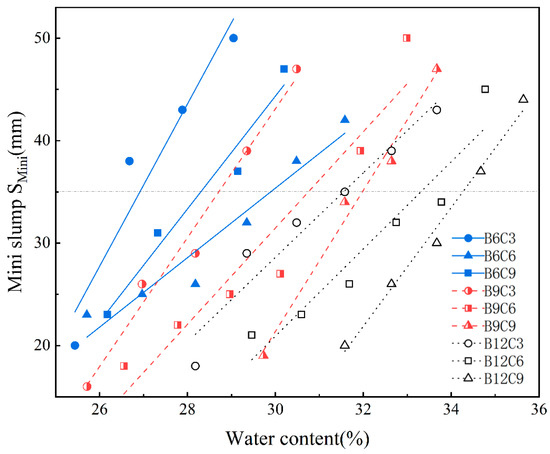 Fan et al. suggest that the optimal range of slurry flowability is 22–48 mm (mini slump). This paper adopts the middle value of 35 mm as the criterion for fluidity [31]. According to the fitting relationship in Figure 3, the corresponding moisture content and actual mini-slump of each group when the mini-slump was approximately 35 mm are shown in Table 3.