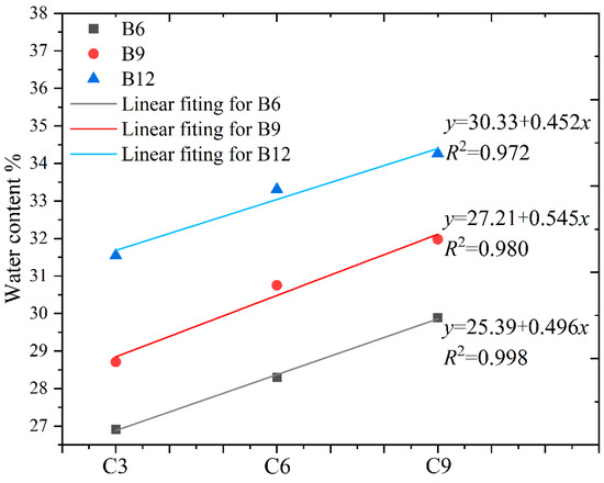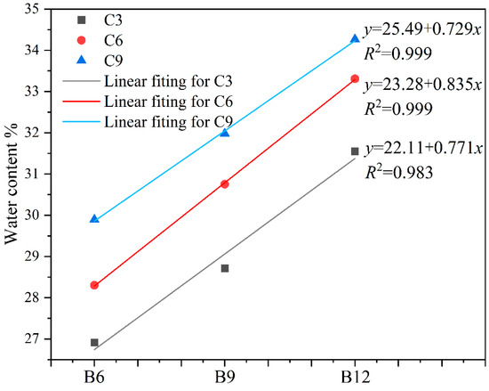 In practice, slurry fluidity significantly affects the quality of the cut-off wall. Higher water content facilitates construction by improving slurry fluidity but impairs the performance of the cut-off wall. Conversely, lower water content enhances the performance of the cut-off wall but increases the risk of local defects in construction due to high viscosity, resulting in poor quality of the cut-off wall. Therefore, only by conducting research based on reasonable fluidity can we balance the relationship between material performance and construction quality. To ensure that the fluidity of all the SCB slurries in the experiment could meet the construction requirements, slump tests with different water contents for each proportion of slurry were performed in pre-experiments using a mini-slump bucket. The relationship between the water content and mini-slump bucket slump for different slurry ratios was shown in Figure 3. Then, the water contents and slumps of the same proportioned slurries were fitted. The results showed that there was a linear correlation between water content and slump, with a correlation coefficient (R2) ranging from 0.88 to 0.98.