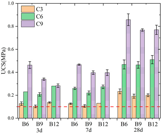 The test results indicated that the UCS value of backfill increased as cement content increased at a certain bentonite content. In the B6 group, at different ages, mean UCS values in C6 and C9 were 95.5 and 88.0% higher than the ones in C3 and C6, respectively. In the B9 group, at different ages, mean UCS values in C6 and C9 were 116.3 and 70.0% higher than the ones in C3 and C6, respectively. In the B12 group, at different ages, mean UCS values in C6 and C9 were 123.2 and 32.4% higher than the ones in C3 and C6, respectively. The data showed that the increase in the average strength at each backfill age gradually became larger when the cement was increased from 3% to 6%. At a certain cement content, the UCS of the backfill changed with the bentonite content without exhibiting an obvious pattern. This contradicts the findings of Hui et al. [30] and Wu et al. [45], who reported that the sample strength decreased with the increasing bentonite content. Among these groups, the C3 and C6 groups exhibited a trend of first decreasing and then increasing with the addition of bentonite, and the C9 group exhibited a decreasing trend and then stabilized. There are several reasons for this phenomenon. First, as the bentonite content increases, the moisture content of the backfill increases and results in changes in the pore structure of the backfill. Second, in the hydration process, bentonite and cement compete for water, thereby resulting in different degrees of hydration of the backfill. Overall, the increased bentonite content at a larger cement content in the backfill directly affects the degree of hydration of the cement.