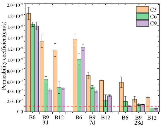 As shown in Figure 7, as curing time increased, the backfill permeability coefficient significantly decreased. When the bentonite content was 6% (B6), the backfill permeability coefficient at an early age was larger; however, its decline with time was more obvious. When the bentonite content was 9% and 12% (B9 and B12 groups, respectively), the permeability coefficient of the backfill reached a smaller value at 3 d and changed less with curing time. A common criterion for the cut-off wall is a permeability coefficient of <1 × 10−7 cm/s after 28 days curing. We indicated the basic permeability coefficient criterion with a red dashed line in Figure 7 [16].