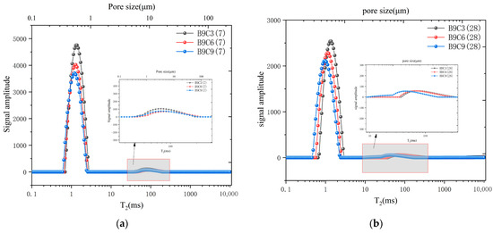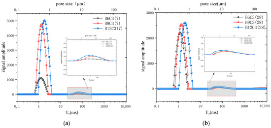 To investigate the micro-porosity of SCB specimens, we chose the specimens of C3 (B6, B9, and B12) and B9 (C3, C6, and C9) cured for 7 d and 28 days for NMR testing. A previous study showed that the peak area of the T2 spectrum collected by the NMR test reflects the amount of physically bound water in the sample [48]. Thus, the first peak can be considered as a signal generated by the adsorbed water representing small pores, and the second peak is a signal generated by free water representing large pores.