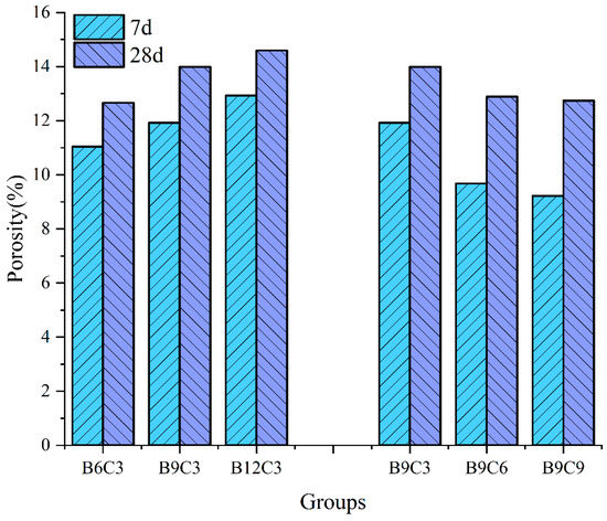 This subsection presents the effects of different ratios of bentonite and cement on the porosity of the SCB backfill for groups C3 (B6, B9, and B12) and B9 (C3, C6, and C9) as examples. Figure 10 shows that with the increase in bentonite or cement, the porosity of the SCB backfill exhibits an opposite trend, that is, increasing the bentonite content increases the porosity, while increasing the cement content decreases the porosity. This is because more water is required in the backfill with a high bentonite content for a fixed slump of the SCB backfill, which can lead to an increase in the initial water content of the backfill; consequently, this leads to a higher backfill porosity [30,45]. Meanwhile, the porosity of the backfill decreased with an increase in the cement content, but the decreasing trend slowed down. This indicates that adding cementitious materials with a content greater than 6% in group B9 did not significantly reduce the porosity of the backfill.