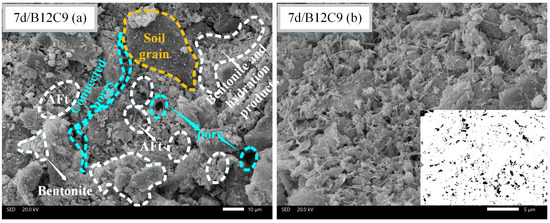 Different backfill micromorphologies can be observed at different curing times. Figure 11, Figure 12 and Figure 13 present the SEM images of B12C9 (7days), B12C6 (7days), and B12C6 (28 days), respectively. The (a) sections in Figure 11, Figure 12 and Figure 13 are micrographs magnified by 1000 times, and the (b) sections are micrographs magnified by 3000 times. Moreover, the b sections in Figure 11, Figure 12 and Figure 13 were binarized to qualitatively examine the variations in their pore frameworks. As shown in Figure 11a, the bentonite is flaky with curly and smooth characteristics. Furthermore, a large number of hydration products in the backfill, such as needle-like ettringite (AFt) and hydrated calcium silicate, are surrounding the perimeter of the soil particles together with the bentonite. These mixed hydration products fill the spaces between the soil particles, leading to an increase in the strength and a decrease in the permeability of the backfills.