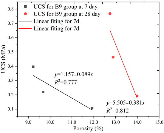 Some studies have reported a functional relationship between porosity and strength [50]. We compared the porosity and UCS data of groups C3 and B9 to analyze the relationship between the porosity and strength data of SCB backfills with the same flow conditions.