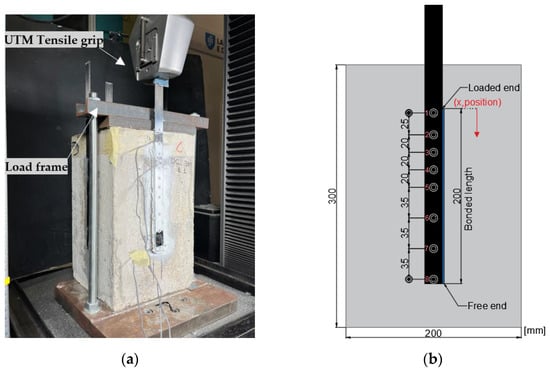 The single-lap shear test method was used to assess the bond behavior to concrete of both the conventional and the bio-based CFRP laminates; a minimum of three specimens were tested per type of laminate. Figure 1a shows an overview of the test setup; the concrete blocks were placed in a steel loading frame (made of two thick steel plates and two threaded steel rods) that was connected to a UTM from Instron, model 5982 (load capacity of 100 kN). Before the tests, the blocks were aligned using a laser level to minimize any eccentricities between the loading and longitudinal directions of the CFRP laminates. Then, the specimens were loaded in tension at a speed of 0.4 mm/min [19,20].