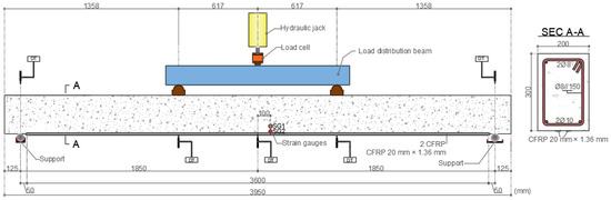 The beams were monotonically loaded up to failure (using a hydraulic jack with 500 kN of capacity) at an average speed of 0.50 kN/s (until the yielding of the bottom steel rebars). The applied load was measured using a load cell (with capacity of 400 kN) and the vertical displacements of the beams at different locations (Figure 2) were monitored with electrical displacement transducers (DT, from TML, model CDP-100, precision of 0.01 mm). The axial strains of each CFRP laminate were measured at the midspan section with electrical strain gauges (from TML, model FLKB-6-11-3LJC-F).