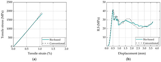 Behavior of representative specimens for bio-based and conventional laminates for (a) tensile and (b) ILS tests [17].