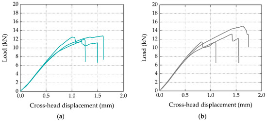 Figure 4 shows the load vs. crosshead displacement curves obtained for three specimens of each test series (in arbitrary order); in both types of specimens, the curves can be divided into three main stages: (i) a first stage up to loads of 7–8 kN, with an approximately linear response; (ii) a second stage characterized by a lower overall slope (i.e., stiffness), exhibiting a progressive stiffness reduction for load values approaching the maximum load, followed by (iii) a final stage presenting an abrupt load reduction (or, in some specimens, a two-step load reduction) corresponding to the failure of the bonded connection. In terms of bond strength (i.e., maximum loads), both types of specimens presented similar average values, with 12.3 kN vs. 13.2 kN for the bio-based and conventional laminates, respectively. The slightly higher (7%) bond strength of the specimens strengthened with conventional laminates was within the experimental uncertainty; the coefficient of variation (CoV) was 5% and 14%, respectively, for the test series with bio-based and conventional laminates.
