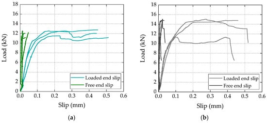 Figure 5 presents the load vs. slip curves, for three different specimens (in arbitrary order), measured at the free and loaded ends of the laminates for both test series. Regarding the curves obtained at the free end of the laminates, both series presented negligible slip values (less than 0.05 mm); this result confirmed that for both conventional and bio-based laminates, the adopted bonded length (200 mm) was higher than the minimum anchorage length necessary to maximize the capacity of the bonded connections; as confirmed in the next section, this result showed that, for the materials and geometry of the specimens used in this study, the effective bonded length was shorter than (or, at the limit, equal to) the adopted bonded length.