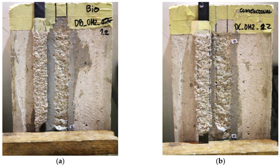 An overall similar behavior was also observed in the failure modes of specimens comprising both types of laminates; as shown in Figure 6, a cohesive failure within the superficial layer of the concrete was observed along the bonded length of both bio-based and conventional CFRP laminates. Future research is needed to assess/compare further the bond behavior of the bio-based laminates, in which different failure modes can occur (e.g., using higher concrete grades might impose interfacial debonding failures, given the slightly lower ILSS of the bio-based laminates, which can have a non-negligible impact on bond strength).