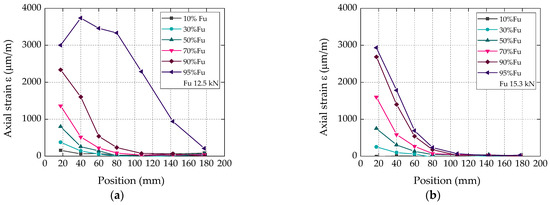 Axial strain distributions along bonded length (position x in Figure 1b) of representative specimens with (a) bio-based and (b) conventional CFRP laminates, for different fractions of the failure load.