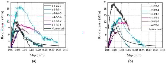 The experimental bond vs. slip curves are illustrated in Figure 8, where each curve is representative of the average/local bond behavior between pairs of positions along the bonded length (the procedure used to determine the shear stress vs. slip curves is explained in Firmo et al. [29]). The typical ascending and descending branches of the shear stress vs. slip response were captured, with the curves of both laminates presenting (as expected) an overall similar shape, with well-defined values of maximum shear stress.