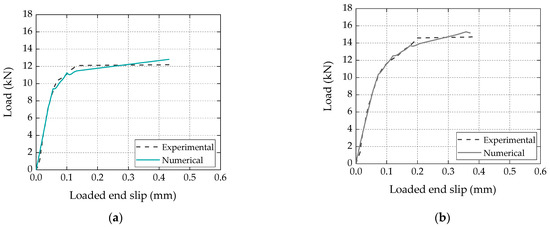 Comparison between numerical and experimental load vs. slip curves for (a) bio-based and (b) conventional laminates.