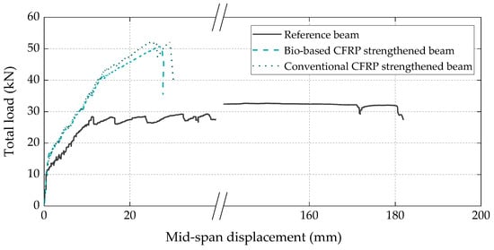 Figure 10 presents the load vs. displacement curves of the three full-scale RC beams. The behavior of all beams was consistent with the typical flexural response of conventional RC and CFRP-strengthened RC members, exhibiting the following three main stages: elastic, elastic-cracked, and elastoplastic. In the elastic stage, the strengthened beams exhibited similar cracking loads and stiffness when compared to the reference beam, whereas in the elastic-cracked stage, both CFRP-strengthened beams presented a slightly stiffer response than the reference beam due to the (more significant) contribution of the CFRP laminates. Regarding the elastoplastic stage of the strengthened beams, as expected, it was significantly shorter than that of the reference beam, as in the former beams the CFRP laminates detached relatively early during the steel yielding phase, which is typical of the EBR technique (the failure modes are detailed ahead). Both strengthened beams exhibited similar flexural strength, with failure loads of 51 kN and 52 kN, respectively, for the beams with bio-based and conventional laminates, which corresponded to a flexural strength increase of around 60% when compared to the reference unstrengthened beam.
