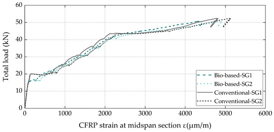 The total load vs. axial strain curves measured in the CFRP laminates at the midspan section (Figure 11) also exhibited the three main behavioral stages identified on the load vs. displacement curves (Figure 10) and, again, demonstrated that the bio-based laminates exhibited an equivalent structural efficacy to that of the conventional ones, with both attaining the same maximum strain (5.1‰) at the CFRP debonding instant.