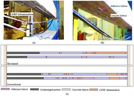 Figure 12a,b show an overall view of the bottom surface of the strengthened beams after failure, and Figure 12c presents a schematic illustration of the different (local) failure modes along the CFRP strengthening system detected by visual inspection after the tests, identified as follows: (i) a cohesive failure of the superficial layer of concrete; (ii) a cohesive failure within the adhesive layer; and (iii) a CFRP delamination involving an interlaminar shear failure within the superficial layer of the laminates (identified by some carbon fibers attached to the adhesive); the length of the CFRP laminates that remained adhered to the substrate was identified as the “undamaged portion”. It is still worth mentioning that a failure at the concrete–adhesive (C-A) interface was not observed. Figure 12c shows that the beam strengthened with conventional laminates presented larger undamaged areas and a higher area of adhesive failure than the beam strengthened with the bio-based laminates; however, the latter exhibited a larger area of concrete failure and CFRP delamination, which may be attributed to a lower interfacial adhesion between the bio-resin and the carbon fibers, also reflected in the (slightly) lower ILSS mentioned in Section 4.1.
