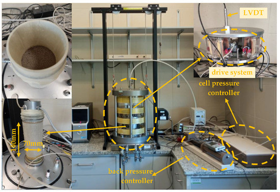 To characterize the dynamic properties of the mixtures, a GDS resonant column apparatus was used. Figure 3 shows photographs of the sample diagram and the experimental apparatus. Details of this instrumentation can be found, for example, in the manual of the GDS resonant column [41].