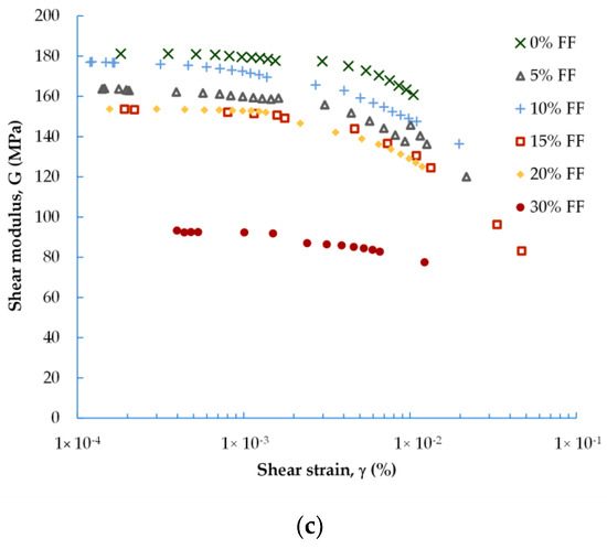 - For the tested fRCA mixtures, it was possible to apply the criteria for strain regimes from the literature on a natural aggregate and determine the linear and volumetric cyclic threshold strains. The stiffness distribution of fRCA, similar to that of natural soil, exhibited non-linearity as a function of strain, most notably in the range of medium strains at (10−3 ÷ 10−2%). A slight increase in the γtl threshold strain, together with a slight decrease in the γtv threshold strain, with increasing FF content was measured.