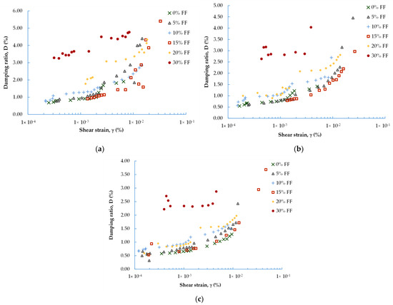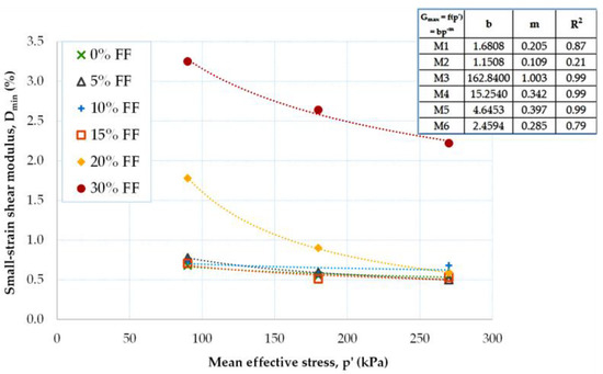 Regardless of the FF content, there is a strong relationship for each blend between the G and D parameters and the mean effective stress (p′). The increase in the stiffness of the mixture and the decrease in the mixture’s damping characteristic with increasing p′ is comparable to the stiffness and damping characteristics of natural soils. It can be observed that the relationships for G = f(γ) and D = f(γ) could be well-fitted by a polynomial function.