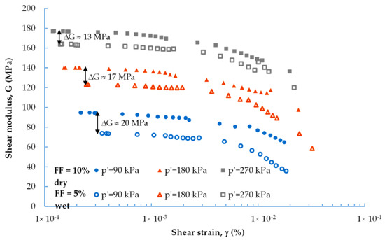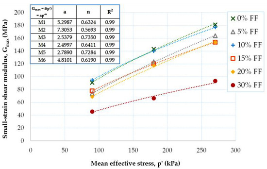From the data in Figure 9, it is possible to quantify the reduction in Gmax with the increasing FF content. For the air-dry mixtures, with an increase in the content of the fine fraction in the mixture, there is a reduction in the value of the Gmax-modulus, which, on average, is about 5%; the reduction in Gmax with the increase in FF is greater for larger values of p′ (e.g., for p′ = 270 kPa ΔGmax ≈ 30 MPa, for p′ = 180 kPa ΔGmax ≈ 26 MPa, for p′ = 90 kPa ΔGmax ≈ 15 MPa). For the moisturized mixtures, a reduction in Gmax with increasing FF for lower pressures is not observed and is only seen for greater pressures, here equal to 270 kPa (a reduction of 10 MPa). Therefore, it appears that in the compositions made by dry tamping, the influence of FF on the stiffness of the anthropogenic soil mixtures is more pronounced. For further analysis and to draw relevant conclusions, more tests are needed. In Table 4, the variation in the small-strain shear modulus is presented with the variation in the mean effective stress for a given FF content.