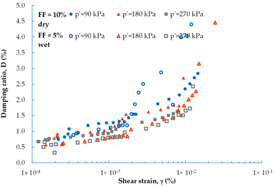 In Table 6, the variation in the small-strain damping ratio according to pressure for a given FF content can be traced. As noted earlier, poorly graded recycled concrete aggregates were characterized by similar damping ratio values, independently of the mean effective stress. For well-graded mixtures with higher FF content, ΔDmin was also higher. For these materials, the pressure dependence of the Dmin parameter was somehow stronger for lower pressures.