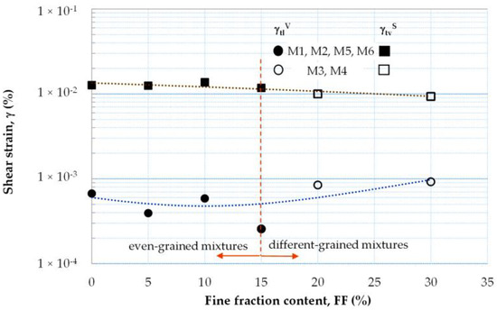 The threshold shear strain amplitudes, which indicate the transition from linear to non-linear elastic behavior (γtlV = γ (G/Gmax = 0.99)) or the onset of settlement (γtvS), are plotted versus fine content in Figure 14. The γtlV and γtvS values that are given were the average of all the tests carried out on the fRCA mixtures. With the increase in FF content, the γtlV values in Figure 14 (dot symbols) increased, whereas the γtvS values (square symbols) decreased. For homogeneous, even-grained mixtures (FF ≤ 15%) (filled symbols), the volumetric cyclic thresholds demonstrated slightly higher values than those for heterogeneous, different-grained mixtures (FF > 15%) (open symbols). In the case of the linear thresholds, the situation was exactly the opposite. The mixtures with FF ≤ 15% exhibited lower γtlV values in comparison with those mixtures with greater fines contents.