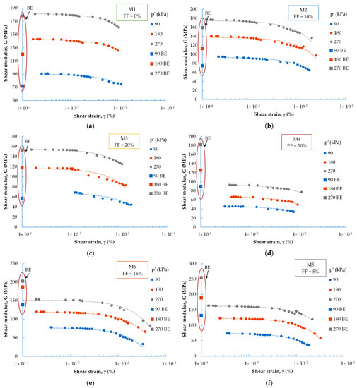 As can be seen from Figure 4 and Figure 5, the results obtained for mixture M4, with FF = 30%, differ from the other mixtures. This may indicate that this percentage of fines content, i.e., FF ≥ 30%, is already sufficient to cause a significant loss of stiffness in the mix (between 26% for p′ = 90 kPa and 40% for p′ = 270 kPa), in comparison with blends characterized by a lower FF content. On the other hand, the addition of a percentage of fines of 30% also causes a significant increase in the damping properties of the mix (between 56% for p′ = 90 kPa and 73% for p′ = 270 kPa). Several studies reported the same observation [48], but this was for natural sandy soils. The studies explained that this variation in the mechanical properties with increasing FF content can be partly explained by the way in which the fines interact with the sand matrix (see the details in Carraro et al. [49]). If the fines are placed in the host soil matrix in such a way that they do not have well-developed contact with the host soil particles, shear waves, for example, will not be effectively transmitted through the fines, resulting in a lower G-modulus.
