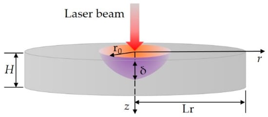 As shown in Figure 1, the ultra-fast laser is assumed to be irradiated vertically from the center of the film. The influence radius of laser heat source and longitudinal penetration depth are r0 and δ, respectively. These two parameters determine the range inside the film into which the ultra-fast laser energy can be radiated. The vertical size and horizontal size of the film are H and Lr, respectively. Where Lr = 750 nm, H = l/Kn. Kn is the Knudsen number, a ratio of mean free path of the energy carriers l to the vertical size H. To simplify the analysis, the film is assumed to be an adiabatic boundary.