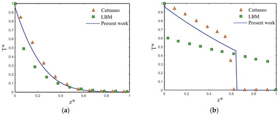 Figure 2a shows the transient temperature distribution at Kn = 0.1 in the diffusive state. All three results show that the diffusion behavior of heat transport is due to the large characteristic length and time scale of the system. The present work is well agreed with the Cattaneo and LBM, and the classical Fourier law also applies in this case [36]. When Kn = 1, the heat transfer changes to a transitional state as shown in Figure 2b. The results of LBM show that the temperature jumps at both ends of the film and the linear temperature distribution inside the film. The present work and Cattaneo show the phenomenon of discontinuities in the temperature distribution, which is one of the characteristics of non-Fourier heat conductions under the CV or DPL model. Compared with LBM, there are some differences in the present work. This is because the error exists in the discretization process during the implementation of the LBM numerical method, while the exact analytical solution is absolutely error-free because it is independent of the size of the domain. The above non-Fourier thermal conductivity models such as Cattaneo and DPL can be viewed as being based on the assumption that there is a time lag between heat flow and temperature gradient, so the results of the present work are more closely related to the Cattaneo. Therefore, the graph truly proves the accuracy of the current mathematical model.