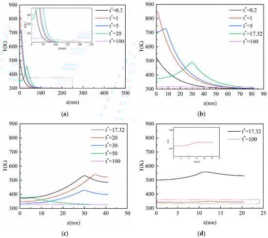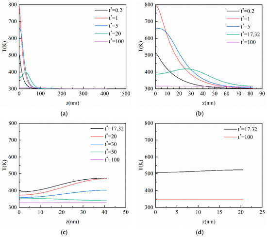 Figure 3. The transient temperature profile inside the film at the center of the action surface in the vertical direction based on the CV model. (a) Kn = 0.1; (b) Kn = 0.5; (c) Kn = 1; (d) Kn = 2.