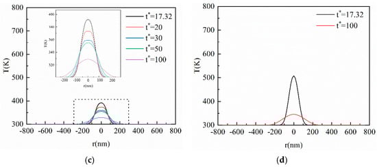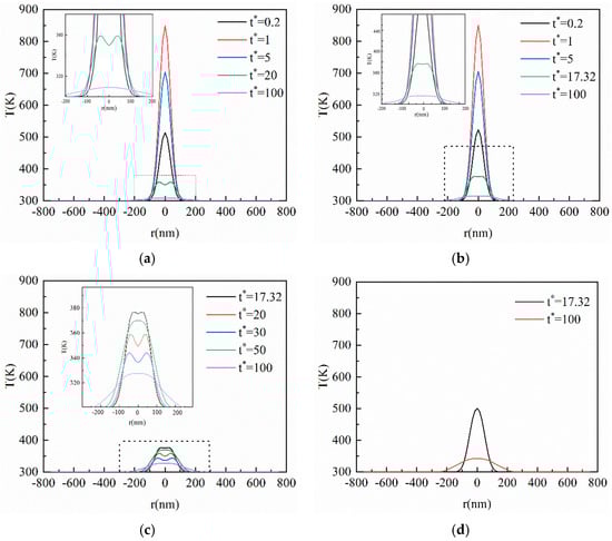From Figure 4a–d, it can be found that the horizontal size affected by the heat increases gradually with the elapse of dimensionless time, but it has not been transferred to the horizontal boundary of the film. This is because the heat transferred in the horizontal direction is much smaller than in the vertical direction. In addition, the horizontal size of the film is too large, resulting in the heat arriving at equilibrium before reaching the horizontal boundary. As is shown in Figure 3c, the transient temperature profile inside the film is transferred in an opposite direction to the vertical direction at t* = 50, which will also affect the horizontal temperature. As can be seen in Figure 4c, the phenomenon of a thermal wave in the horizontal direction disappears at t* = 50, and then the temperature at t* = 50 exceeds that at t* = 30 again. Therefore, the heat transfer in the vertical and horizontal direction will influence each other after the laser irradiates the thin film.