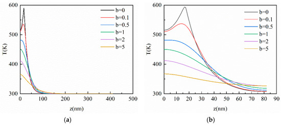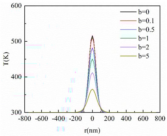 Without considering the external heat source, the temperature distribution of the DPL model at dimensionless time t* is equal to the temperature distribution of the CV model at dimensionless time t* × (1 + b). The detailed explanation is that the heat at the peak temperature of the film is transferred to other areas when the laser irradiates the film. Because of the influence of the hysteresis of the temperature gradient of the DPL model, the heat at peak temperature is transferred more in the film than in that of the CV model. Therefore, compared with the CV model, the temperature peak of the DPL model is lower but the temperature near the peak is higher. In other words, with the dimensionless time elapse, the thermal wave from the DPL model is relatively gentle and the position of the temperature peak changes slowly in the vertical direction.