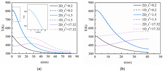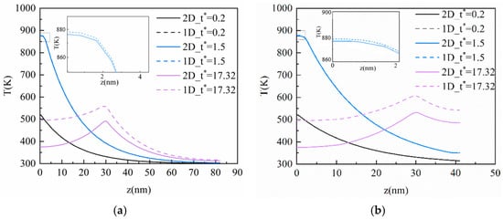 Figure 9 and Figure 10 show the comparison of temperature distribution in the vertical direction of the film between the 2-D and 1-D results of the CV model and the DPL model, respectively, where b = 0.2 in the DPL model. As can be seen from Figure 9, there is no evident difference between the 2-D and 1-D results at t* = 0.2 and 1.5 owing to the short heat conduction process; the ultra-fast laser source mainly acts on the vertical direction at the moment. When t* = 17.32, the difference between the two results become obvious, and the maximum difference is 120.42 K and 124.65 K in Figure 9a,b, respectively, which appears at the left boundary of the film. Although the peak of the thermal wave is reached at the same time (t* = 17.32) and position (z = 30 nm), the 2-D results are lower than those in the 1-D results and the peak difference of the thermal wave is 70.63 K and 75.08 K in Figure 9 (a) and (b), respectively. This is because the 2-D model takes into account the effect of the laser on the horizontal direction of the film. The conduction of heat in the horizontal direction is small at the initial time, but more and more heat in the 2-D model will transfer to the horizontal direction with the elapse of dimensionless time. In addition, as the Kn increases, the film contains more heat, and the difference between the 2-D and 1-D model also increases.