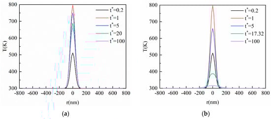In this section, the CV model is applied to analyze the heat conduction process of ultra-fast laser heating nano-thin films. As can be seen from Figure 3a, after the laser irradiates the film, the temperature of the surface subjected to the laser action rises rapidly, then decreases with the elapse of dimensionless time t*, and the heat is gradually transferred to the inside of the film. With the elapse of dimensionless time, the peak temperature point is no longer on the heated surface but appears inside the film. This phenomenon means that the heat inside the nano-thin film is transferred in the manner of a thermal wave. This is because the heat in the film cannot be diffused in time as a result of the hysteresis of the heat flux in the heating process, and the accumulation of heat can produce the phenomenon of a thermal wave. The CV model indicates that the heat transfers not in the manner of diffusion but in a limited speed, which offers a clear difference between the CV model and the Fourier model. In addition, the temperature drops rapidly after reaching the peak, such as in Figure 3a at t* = 5. This is because the energy for the temperature increase in the area near the heated surface is mainly from the laser heat source. With the depth increases in the vertical, the absorption of the laser energy decreases while the heat conduction plays a dominant role. The impact of the laser source becomes less and less as the depth is further expanded, so the heat conduction inside the film is the main mechanism controlling the temperature increase in this region.