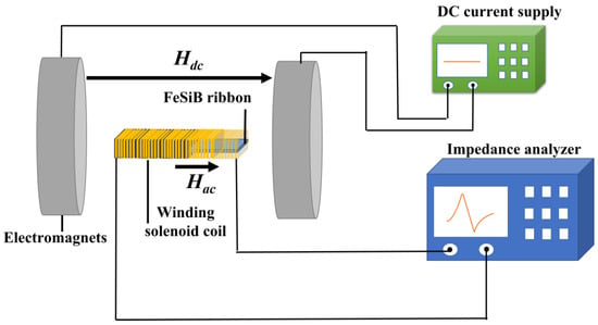 The samples used in this work to perform the experiments were Fe-based amorphous ribbons with a nominal composition of Fe80Si9B11 (at%). The length, width and thickness of a single ribbon were 40 mm, 5 mm and ~25 μm, respectively. The ribbons were annealed at different temperatures for 20 min in air using a muffle furnace. The annealed ribbons were inserted into a rectangular winding coil with an approximate size of 40 × 10 × 10 mm3 and were tightly wound into six layers using 32-AWG magnetic wires in copper. When amorphous ribbons are driven by a magnetic excitation near a mechanical resonant frequency, their impedance (and inductive component) is extremely sensitive to the applied DC field [5,7,36,37]. The inductance and the impedance of the coils with inserted ribbons were measured with a high-precision impedance analyzer (HP 4294A). The resonant frequencies (fr at maximum impedance) and antiresonant frequencies (fa at minimum impedance) on the impedance spectrum were also measured with the impedance analyzer under a DC magnetic bias field (Hdc) along the longitudinal direction of the ribbons [6,38]. It is worth mentioning that the antiresonance occurred at a frequency above the actual mechanical resonance frequency when the impedance contribution from the ribbon minimized the total impedance [12]. The values of k were determined using resonant and antiresonant frequencies, while Q could be directly measured using the two poles (f1 at maximum inductance, f2 at minimum inductance) on the inductance spectrum [4,12,38]. From the frequencies at fr, fa, f1 and f2, the values of k and Q were calculated using the following dependences: and , where also corresponds to the −3 dB bandwidth near the resonance [12]. A schematic diagram of the experiment is shown in Figure 1.