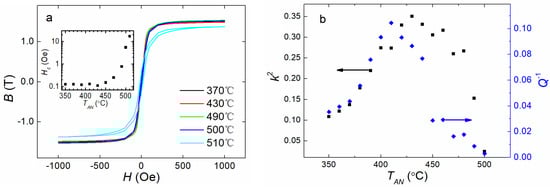 In our previous work [4], we reported on the TAN dependency of k and Q for single FeSiB ribbons; the value of k reached its maximum at approximately a TAN of 430 °C, while Q showed a minimal value at approximately a TAN of 410 °C. The k2 and Q−1 evolutions after annealing at various temperatures TAN are shown in Figure 2b. In the low TAN region, below 400 °C, with increasing TAN, both k2 and Q−1 increased at almost the same pace, indicating that k2 and Q−1 were correlated in the low annealing temperature region. For higher TAN, from 400 °C to 500 °C, the variation in k2 and Q−1 diverged, suggesting that the correlation level of the two parameters dropped significantly. Furthermore, as a result of the collective changes in k2 and Q−1 for low TAN, below 400 °C, the equivalent input loss ξ should have stayed invariable for low TAN, below 400 °C, as reported by our earlier investigations [4].
