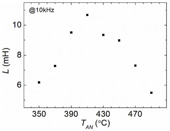 Figure 3 shows the measured values of the inductance (L) at 10 kHz after isothermal annealing at various temperatures TAN. It could be observed that L increased with TAN in the region from 350 °C to 410 °C and then decreased for TAN from 420 °C to 490 °C. As mentioned above in the Section 2, the variation in L values suggested a collective change in the apparent magnetic permeability (μapp) of the ribbon [44], i.e., .