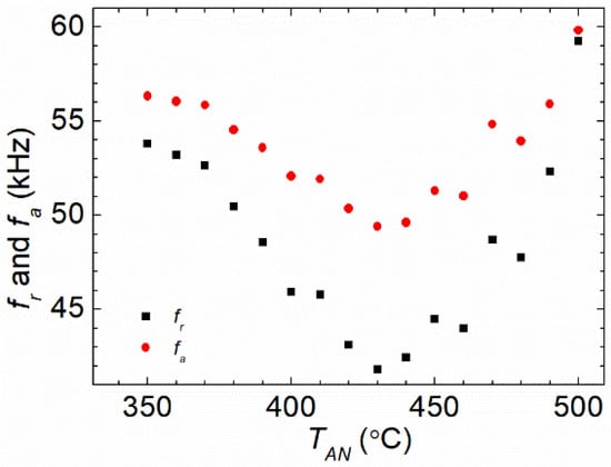 Figure 4 shows the TAN dependence of resonant fr and antiresonant fa. It could be stated that in the low TAN region, both fr and fa decreased with the increase in TAN, reaching a minimal value at 410 °C. Then, they rose as TAN continued to increase. The values of Young’s modulus (E) in the ribbons with lengths matching those of the coils should have been approximately proportional to the square of the antiresonant frequency fa or the square of the resonant frequency fr [12,14,34], i.e., . By comparing the behavior of L and fa (fr) versus TAN, it could be seen that the two parameters exhibited a respective extreme value as the function of TAN. However, the curves of L and fa (fr) showed a lag of 20 °C versus TAN to reach their maximum/minimum values.