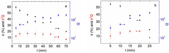 Figure 5a,b display the variations in the k, k2Q and Q factors for different annealing times tAN at TAN ranging from 470 °C to 490 °C, respectively. A significant decrease in the k factor with the increase in the Q factor occurred with the increase in tAN for a TAN of 470 °C and 490 °C. The curve for k and Q showed a cross profile at tAN = 40 min and 15 min, respectively. After the ribbons were annealed for 40 min at TAN = 470 °C and 15 min at TAN = 490 °C, k decreased from approximately 60% to 40%, while the values for Q increased close to 200. The equivalent input loss factors ξ showed a maximum value when the tAN was 20 min for both samples, which suggested the optimal annealing time (20 min) for annealing at 470 °C and 490 °C. Based on the data mentioned above, it was implied that the decrease in k was caused by the surface oxidation and surface crystallization that induced the increase in coercivity through the out-of-plane magnetic anisotropy. The increase in Q factors might have been due to the long-range orderings that took place on the surface regions of the ribbons.