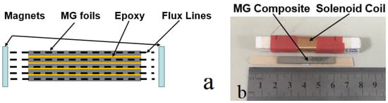 (a) Schematic diagram of a laminated composite consisting of magnetostrictive amorphous FeSiB ribbons bonded with epoxy resin. (b) Photo of laminated metallic glass (FeSiB) ribbon composites and the winding coil used to generate the AC magnetic field.