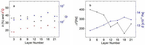 (a) The black curve is the magnetomechanical coupling factor (k) for laminated metallic glass composites consisting of magnetostrictive amorphous FeSiB ribbons as a function of the FeSiB layer number. The blue and red curves represent the values of the quality factors (Q) and efficiency coefficients (k2Q) associated with the maximum values of coupling coefficient k, respectively. (b) The trend of the −3 dB bandwidth (∆f) and Young’s modulus (E) for laminated FeSiB ribbon composites as a function of the FeSiB layer number, where (f1 at maximum inductance, f2 at minimum inductance).
