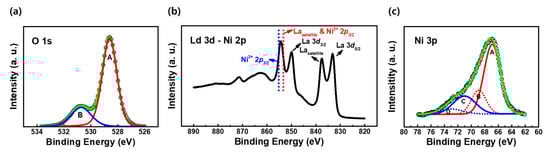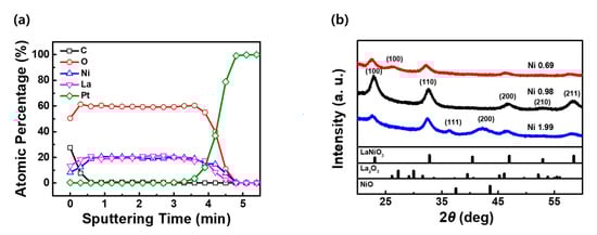 - Qiao, L.; Bi, X. Direct observation of oxygen vacancy and its effect on the microstructure, electronic and transport properties of sputtered LaNiO3−δ films on Si substrates. Thin Solid Films 2010, 519, 943–946. [Google Scholar] [CrossRef]
